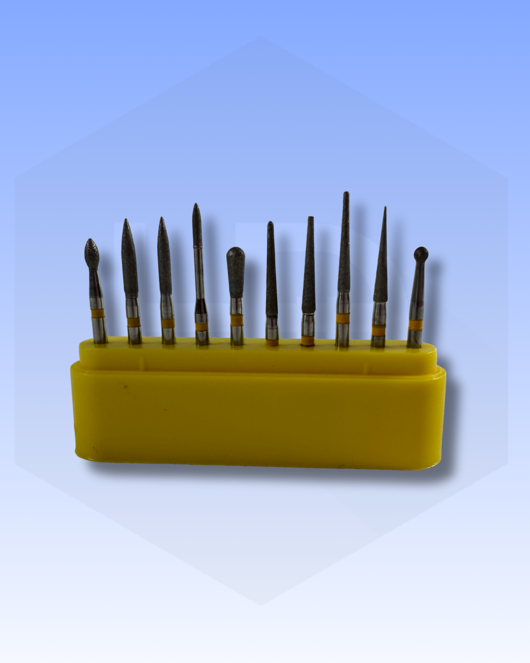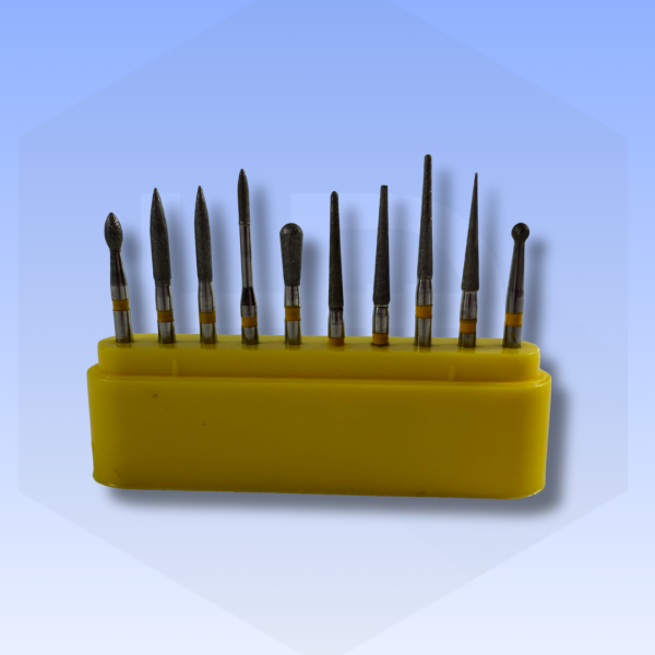 Kit de fresas indicadas para pulir y dar acabado, diferentes formas de fresas redonda, bala, llama, pera, troncoconica. Grano extra fino, aro amarillo. Fresas re utilizables, velocidad operación recomendada 55.000 – 160.000 RPM.
