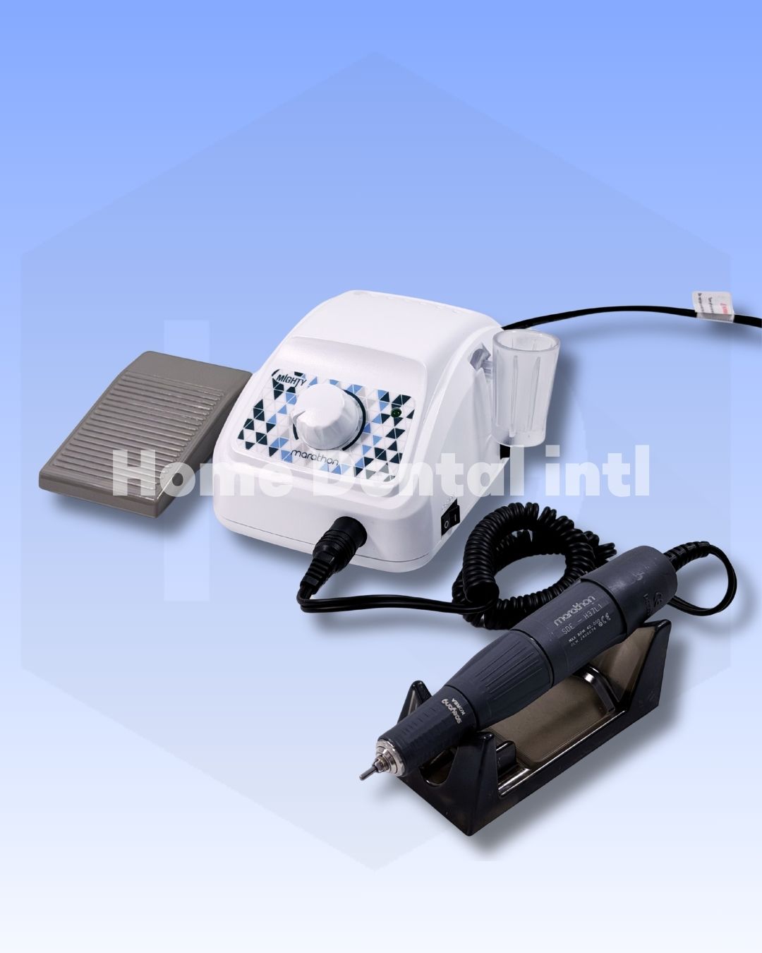 Micromotor versatil y potente 40.000 RPM con control manual de velocidad, pedal on/off, marcha/contramarcha, minima vibración. Torque 300 gf/240 gf, pieza de mano H37L1 ergonomica, rotacion izquierda y derecha.peso de 1.23 – 1.3 kg. Marathon