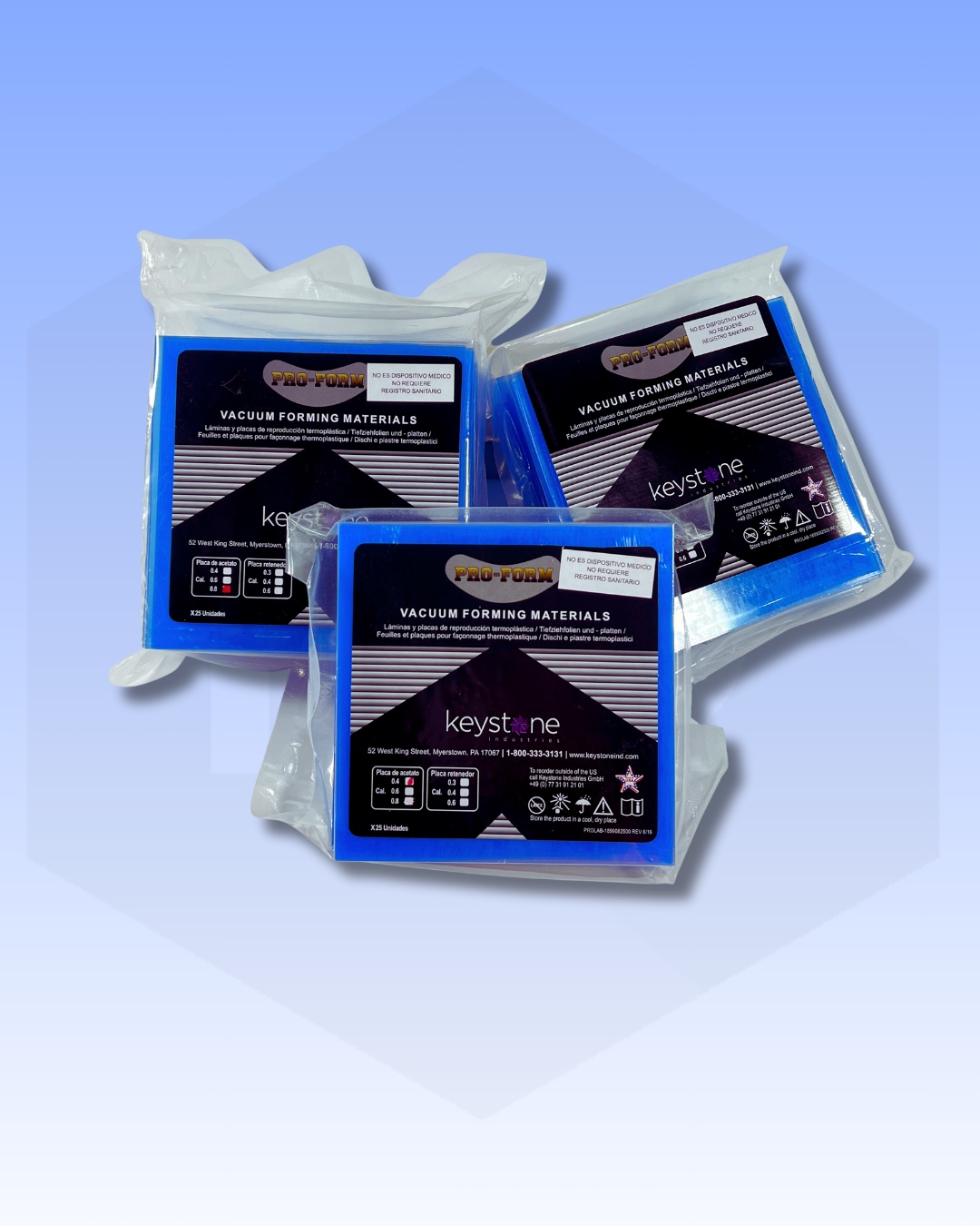 Acetatos en diferentes calibres, ideal para férulas y retenedores. Placa acetato rígida por tamaño (0.40 – 0.60 -0.80) y de látex tamaño 0.40 en presentaciones de 25 unidades. Marca Keystone.