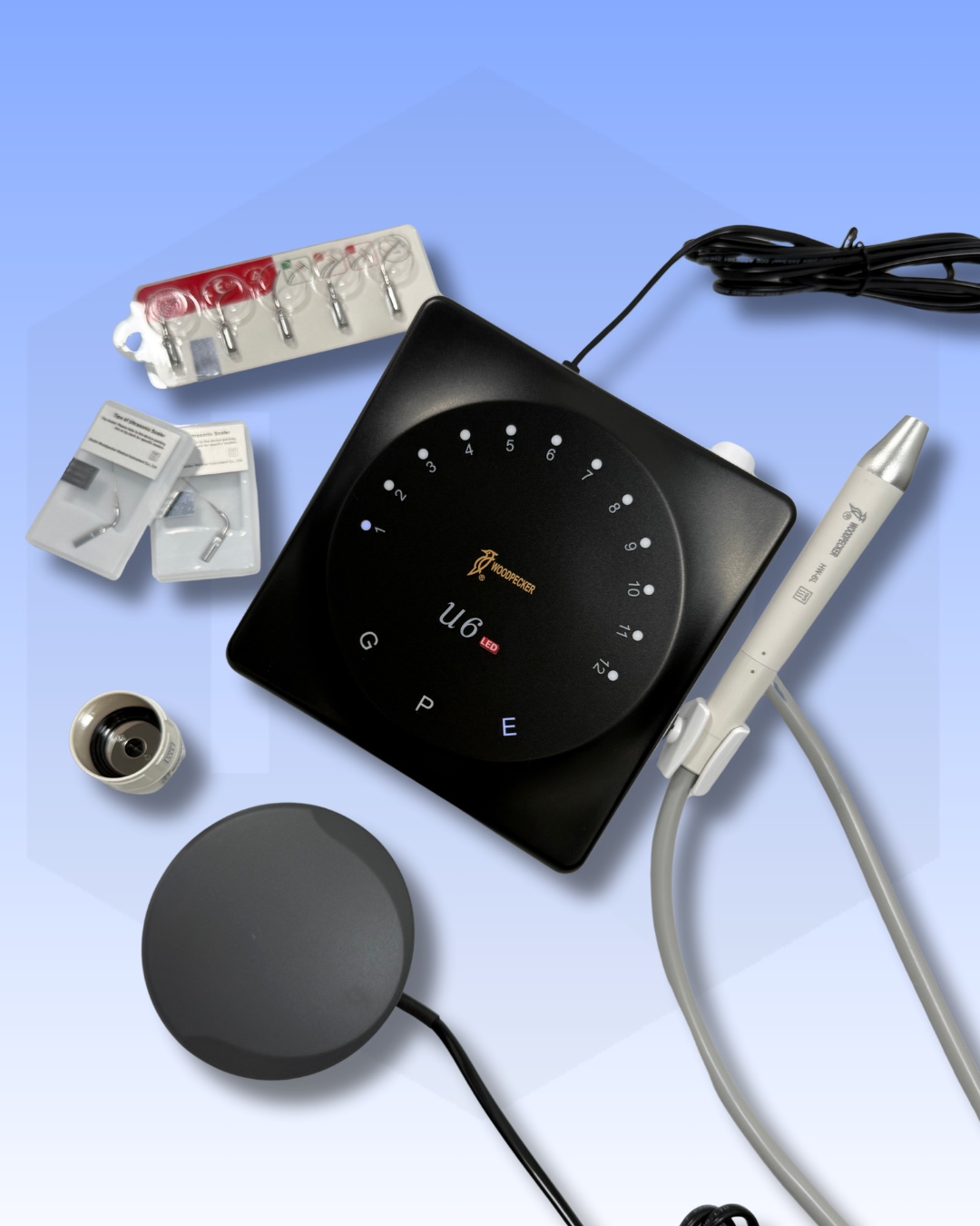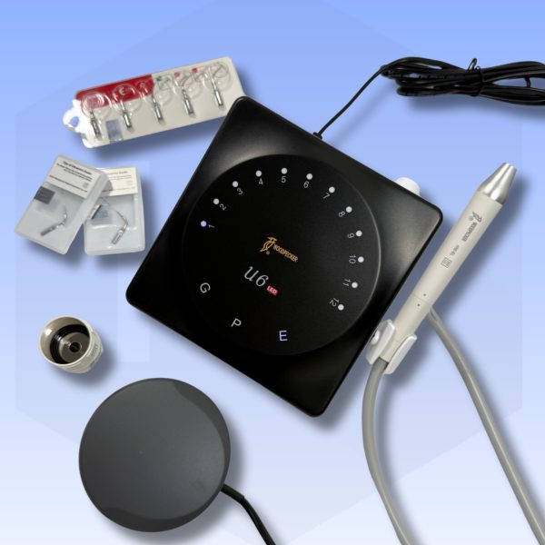 Ultrasonido U6 con pieza de mnao luz led para uso en general, periodoncia y endodoncia. Sistema touch inteligente luminoso, frecuencia oscilación 28Khz +- 3 Khz, potencia 3W – 20 W, dimensiones 175 mm X 144 mm X 77 mm. Pieza de mano desmontable y esterilizable 135º presión de 0.22 Mpa, genera poco calor.